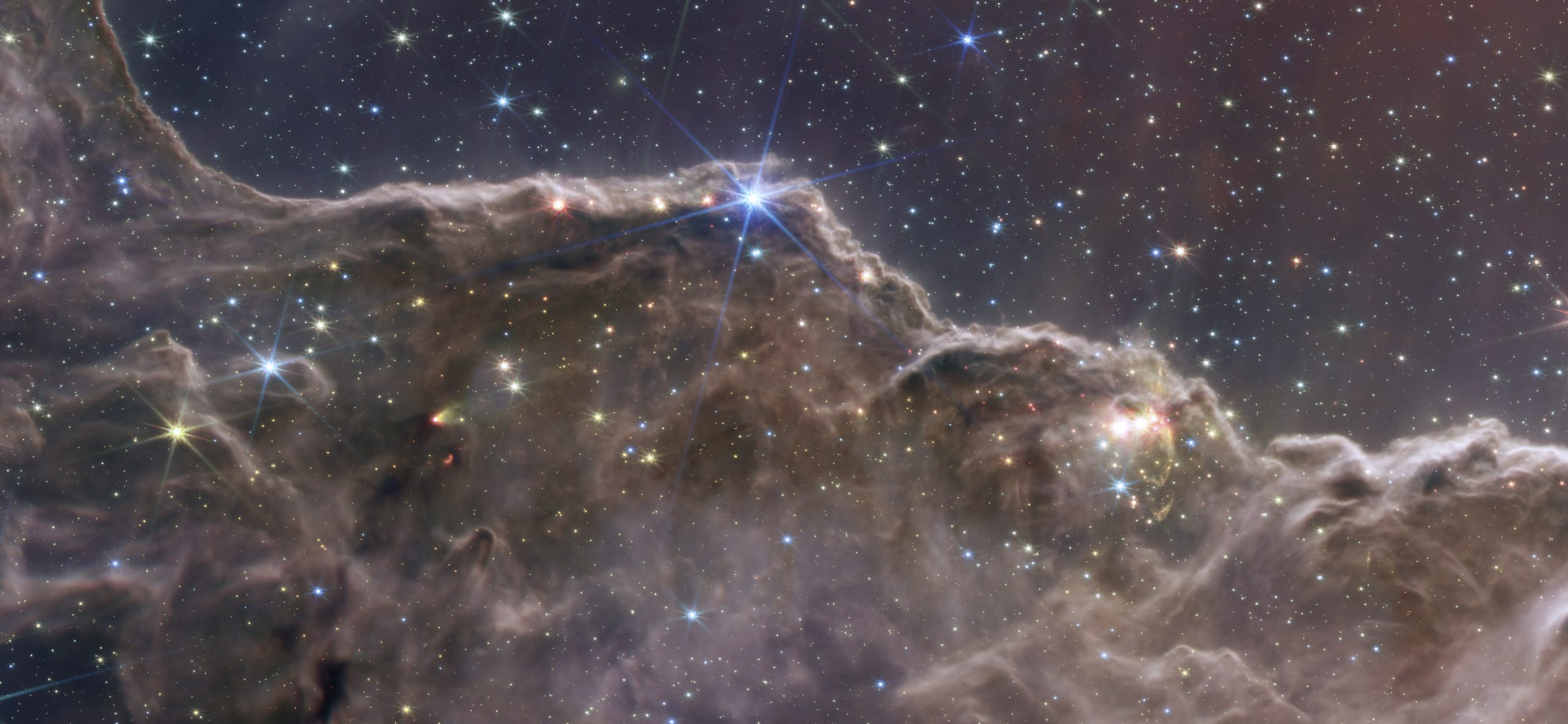 This image released by NASA on Tuesday, July 12, 2022, combined the capabilities of the James Webb Space Telescope's two cameras to create a never-before-seen view of a star-forming region in the Carina Nebula. Captured in infrared light by the Near-Infrared Camera (NIRCam) and Mid-Infrared Instrument (MIRI), this combined image reveals previously invisible areas of star birth. (NASA, ESA, CSA, STScI via AP)